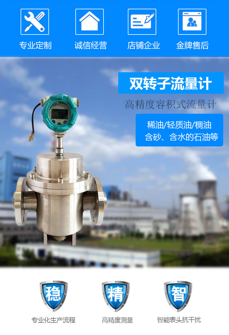 雙轉子流量計是一種設計獨特、經過精密加工裝配的新型容積式流量計。一對螺旋轉子是計量腔體內的運動體,起到分割、測算、運送和排泄被測液體的作用。該型號流量計在結構上增加了定位齒輪,使兩只轉子間在轉動時達到彼此互不接觸。該流量計工作時運轉平穩、噪音低、磨損少、準確度高,粘度適應性強,可以允許被測液體中的微細顆粒通過,從而不易卡表。該流量計經過化學鍍鎳處理,因此具有防腐、耐磨的特性,可代替不銹鋼材質的流量計。
