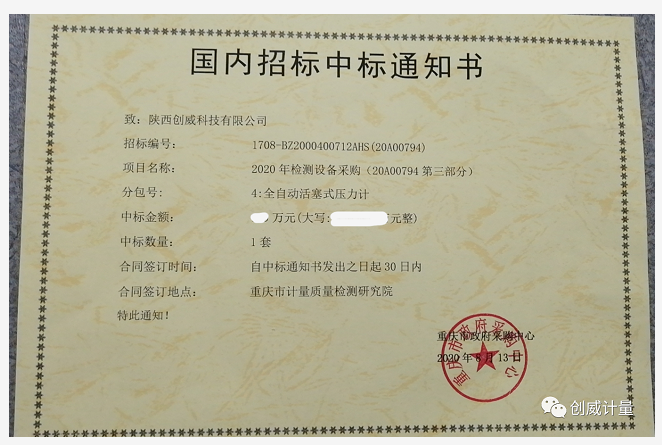 8月13日,我公司一套500MPa超高壓全自動活塞式壓力計,中標重慶市計量質量檢測研究院。