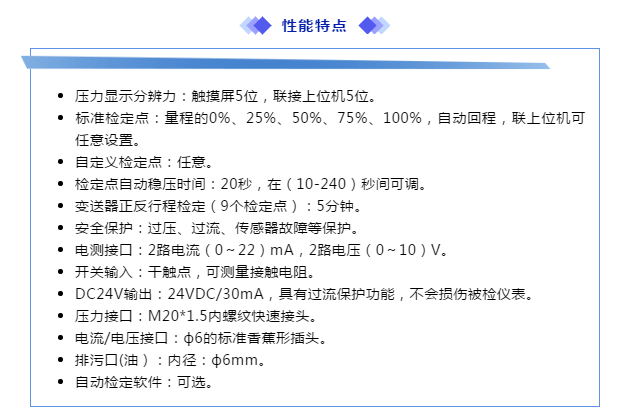 設(shè)備介紹:壓力模塊可以內(nèi)置,也可設(shè)置外置,使得它能夠滿足客戶對(duì)壓力精度的高低需求,模塊的自動(dòng)切換使得用戶操作更為簡(jiǎn)單,適用范圍更寬,智能化的報(bào)警提示,使得故障解決更加便捷,涵蓋5G功能的數(shù)字化遠(yuǎn)程通訊方式,使得用戶可以實(shí)現(xiàn)遠(yuǎn)程校準(zhǔn),配合配套的上位機(jī)軟件,真正實(shí)現(xiàn)了操作的遠(yuǎn)程化,檢定數(shù)據(jù)的可視化、無(wú)紙化,歷史數(shù)據(jù)的查詢化、故障解決的無(wú)人化。優(yōu)異的性能使它能夠完美勝任現(xiàn)場(chǎng)或?qū)嶒?yàn)室校準(zhǔn)工作。