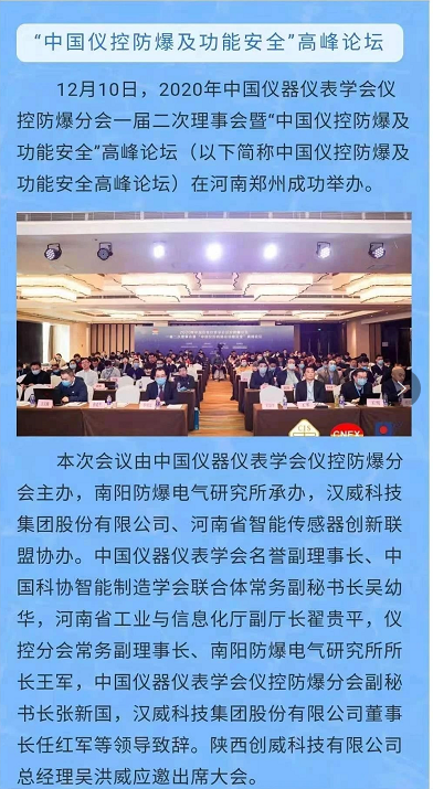 12月10日,2020年中國儀器儀表學會儀控防爆分會一屆二次理事會暨“中國儀控防爆及功能安全”高峰論壇(以下簡稱中國儀控防爆及功能安全高峰論壇)在河南鄭州成功舉辦。