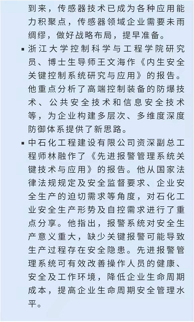 在專題報告環節,儀控分會常務副理事長徐建平,清華大學教授王雪,浙江大學控制科學與工程學院研究員、博士生導師王文海,中石化工程建設有限公司資深副總工程師林融等行業專家學者根據當下熱點話題做專題報告。我國經濟由高速增長轉向高質量發展,安全儀表行業企業因涉及面大、服務范圍廣等特點,更需要推進多角度創新,突破面臨困境,執著做專做精,著力轉型升級,實現安全儀器儀表行業高質量發展目標。