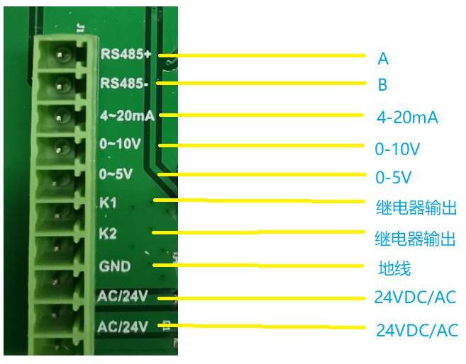 1: 24V直流供電,接24VDC/AC的任何一個為供電正,地線接GND