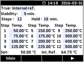 在自動步進功能下可以設置12個溫度點, 同時可以設置停留時間。 甚至可以設置穩定判據. 僅需開始運行,干體爐可以自動運行。